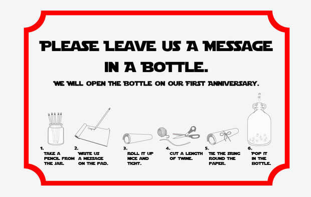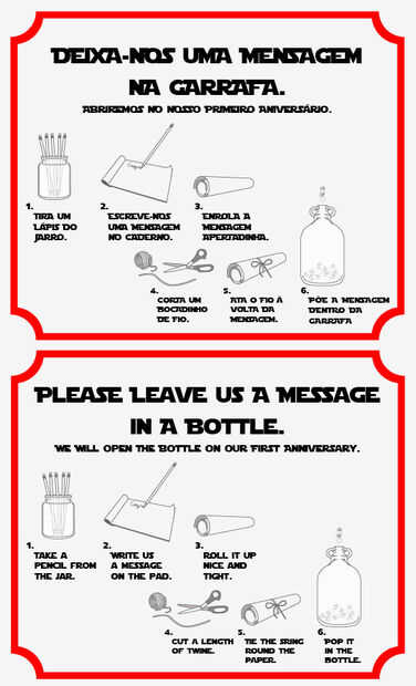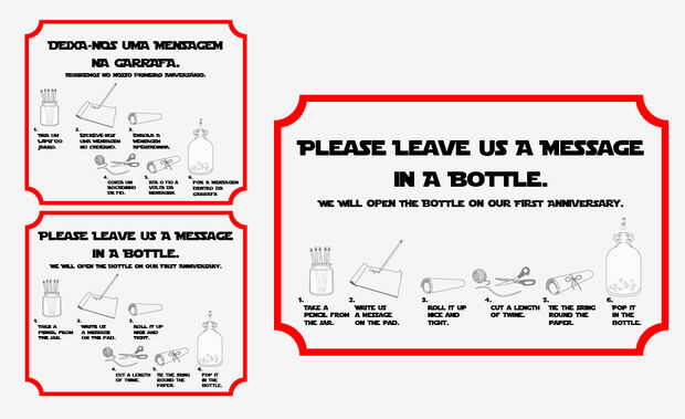 La botella más pequeña necesita de dos etiquetas que estábamos usando para la boda de Lisboa y habría una mayoría de hablantes de portugués allí por lo que hemos querido uno en su lengua nativa y otro para lo de habla inglesa. Primera fue la boda inglés y hablantes de Inglés de la segunda boda ya habían hecho el mensaje en la botella en el Reino Unido por lo que ya sabían qué hacer, pero ponemos una instrucciones de lengua inglesa en la parte posterior de la botella.