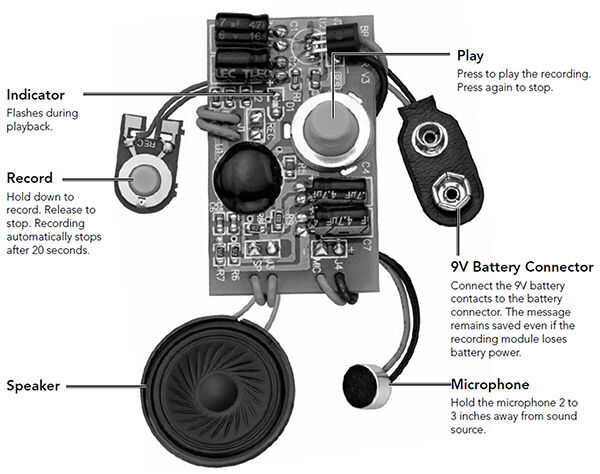 Primeras cosas primero, Desempaque su módulo de la grabación, puede conectarlo a la batería de 9V y asegúrese de que está funcionando hacia fuera de la caja. Si tienes que mantenga presionado el botón de registro a registro y simplemente pulsar una vez el botón de reproducción para escuchar la última grabación. Este módulo particular registra un máximo de 20 segundos y sólo reproduce lo grabado.