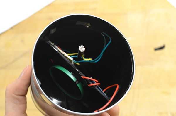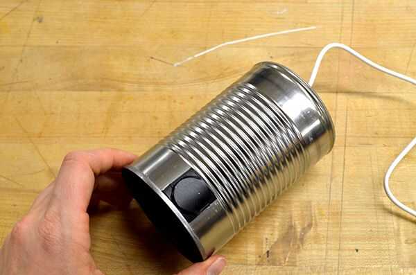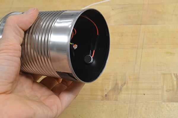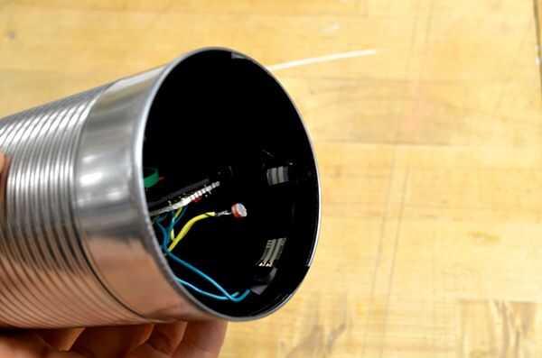 Del mismo modo, graba los cables de micrófono a la lata para que se sienta en una posición segura. El único elemento que simplemente se suspende de sus cables es el resistor de la foto. Quería permanecer en el centro de la lata para que se producir uniformemente.