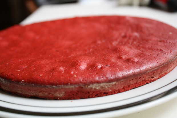 Elegir tu receta de pastel de terciopelo rojo favorito y hornear en una bandeja. Después de la cocción, deje que se enfríe hasta temperatura ambiente. Aceleró el proceso mediante el uso de la nevera.