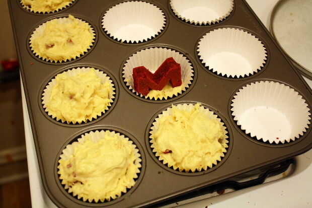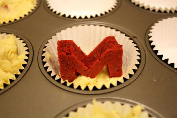 Poner una pequeña cantidad de masa de vainilla en la parte inferior de cada papel de Magdalena. Luego coloque un pedazo de terciopelo rojo corta en un cupcake y llenar todo el terciopelo rojo con vainilla más. Asegúrese de cubrir la parte superior de la pieza de terciopelo rojo, así.