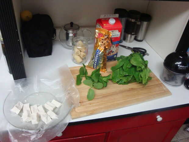 ingredientes:Leche de almendras1/2 taza de almendras, remojada durante la noche1 1/2 tazas de agua filtradaBatido de frutas3 cucharadas de hojas de menta (llenos)1 1/2 plátano congelado2 cucharadas de tierra chia2 cucharadas semillas de cáñamofechas