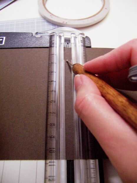 Puntuación y doblar el pedazo grande de cartulina marrón a través de la dimensión más corta en el centro, en 5 1/2". Me gusta marcar colocando la cartulina en mi cizalla, y utilizando la ranura para guiar mi lápiz. Esto no funciona con trimmers de papel de estilo guillotina (el tipo con un brazo que subir y bajan).