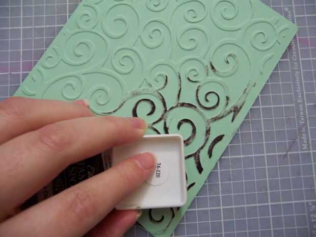 Frotar la superficie de la almohadilla de tinta de chispas de Chocolate sobre las zonas de relieve. Si desea aplicar la tinta más precisamente puede utilizar un hisopo de algodón o incluso el dedo, pero me gustaría dejarla mirando un poco irregular y "vintage".