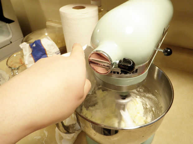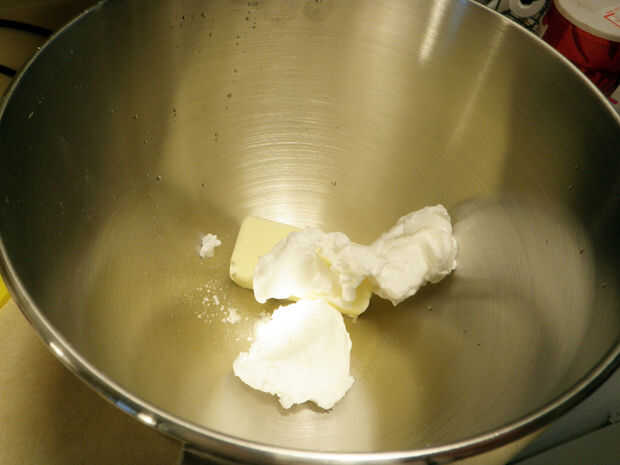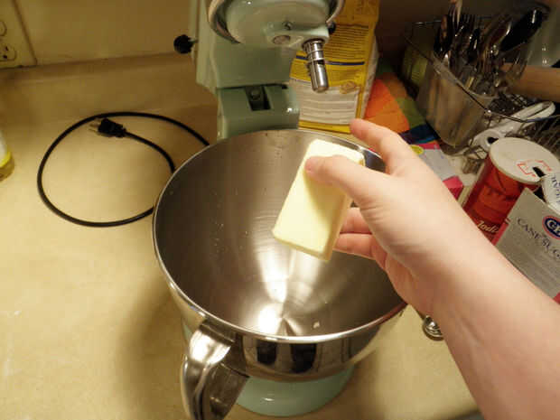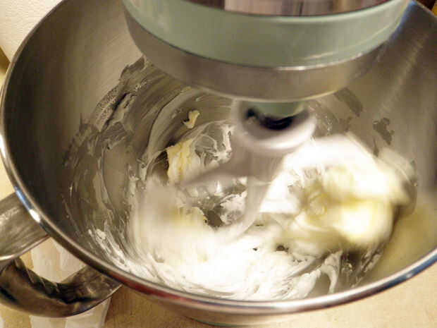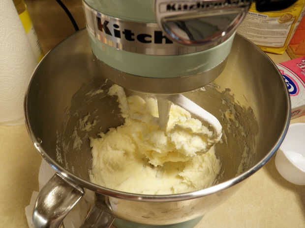 Se mezclan 1/2 taza de mantequilla, 1/2 taza de manteca (o mantequilla más) y 1 taza de azúcar.