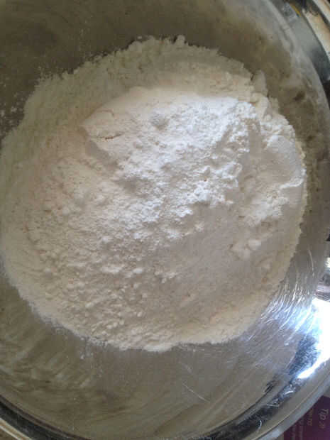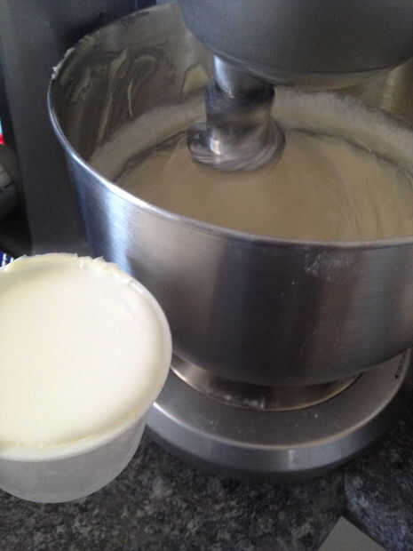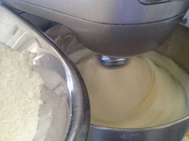 Bajar la velocidad y batir harina alternando con la mezcla de leche, comience con el final de la harina con la harina