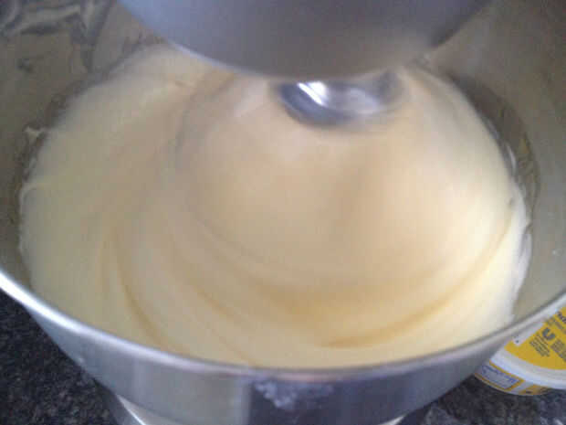 En un recipiente aparte, batir azúcar, mantequilla y huevos a velocidad baja durante 30 segundos y venció en alto por 3 minutos, raspando los lados de vez en cuando.