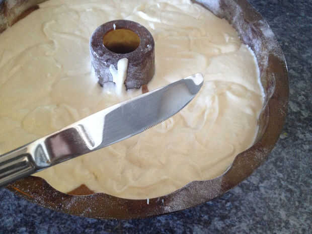 Vierta la mitad de la masa blanca en, superior con la mezcla de café entonces el resto de la masa blanca