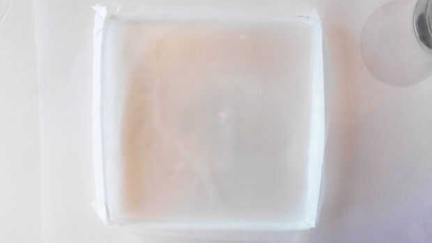 4. Una vez que la cera se ha derretido, vierta la mitad de ella (1,9 oz.) en el envase cuadrado.