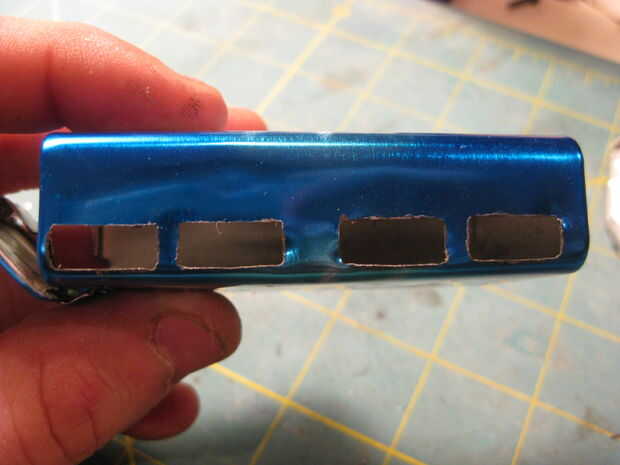 Coloque un pedazo de cinta en el lado de la casa de moneda lata desea que los puertos USB. La transferencia de las medidas tomadas anteriormente en la cinta. Tener en cuenta que necesita ser alineada cuando el cubo se coloca dentro de la bandeja, por tanto, puede que necesite dejar un pequeño espacio a cada lado. Coloqué un paño en mi superficie de trabajo mientras que corte los orificios para proteger la lata sea rasguñada. Utilizar la dremel para lentamente y con cuidado cortar los puertos. Más limpio el corte, mejor el acabado para este proyecto así que Tómese su tiempo y deje que la dremel haga el trabajo. Los cortes más pequeños pueden ser difíciles de hacer sin rayar el resto de la lata. Un buen método es usar desgastados discos de corte son más pequeños en tamaño y capaz de estos recortes pero como anotar la superficie suficiente, puede perforar cada puerto de salida con un destornillador y terminar con un archivo. Una vez que hayas hecho los cortes, limpiar los bordes con una mano archivo y prueba de ajustan su hub. Es mejor cortar demasiado pequeño en este caso, puede corregir pequeños errores con una lima de mano.