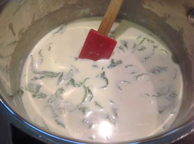Mix 1 3/4 taza de crema de leche, leche entera de 1 1/2 tazas y 3/4 de taza de menta fresca en una olla a fuego bajo. En un recipiente aparte mezclar 4 yemas de huevo y 3/4 taza de azúcar con un batidor hasta que esté ligera y esponjosa y encienda la luz amarilla.
