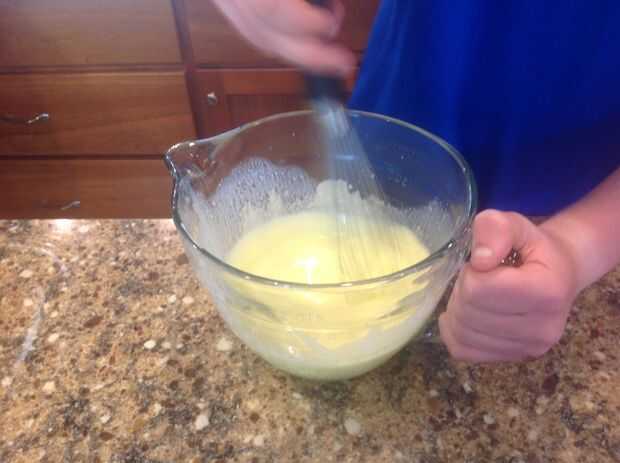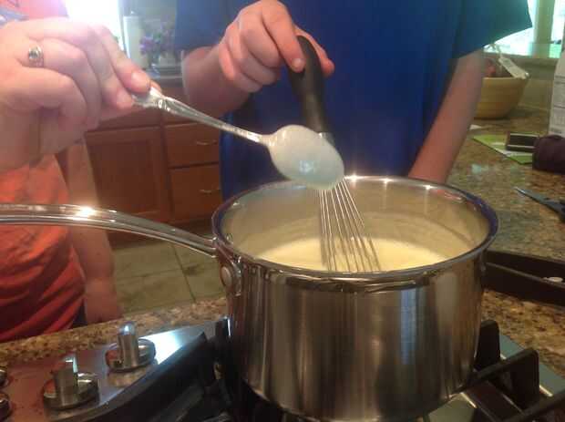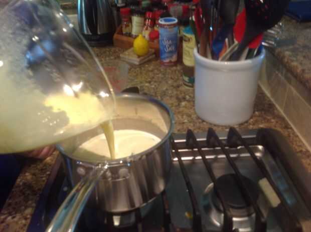 Mezclar 1 taza de la mezcla de crema caliente con las yemas de huevo, luego agregar la mezcla de yema de huevo a la cacerola. Seguir cocinando y revolviendo por un par de minutos más, hasta que la crema cubre la parte posterior de una cuchara.
