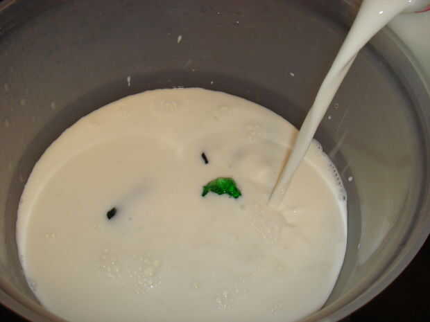 helado de menta chip! Muy Bueno!Paso 1: Paso 1 Mix 1 3/4 taza de crema de leche, leche entera de 1 1/2 tazas y 3/4 de taza de menta fresca en una olla a fuego bajo. En un recipiente aparte mezclar 4 yemas de huevo y 3/4 taza de azúcar con un batidor