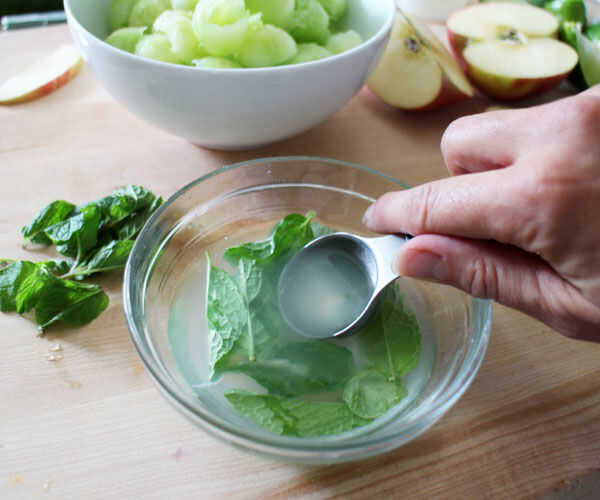 Ahora añadir la 1/2 taza hojas de menta (extraídos de tallos en el paso anterior), 1/2 taza de jugo de limón fresco y un almíbar en un recipiente de mezcla o mortero. Machacar las hojas de menta con el dorso de una cuchara o mortero infusionar menta en los líquidos.