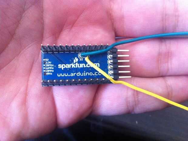 El ChronoDot utiliza las líneas I2C: A4 y A5. Arduino Pro Mini, ésos no están vinculados a las líneas de perno del estándar pero son explotados en pernos adyacentes. La foto muestra la ubicación de las líneas de la parte inferior.