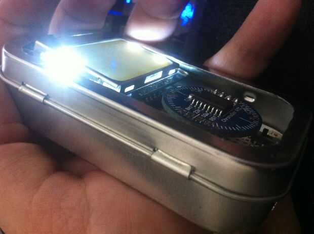 Apague la energía del dispositivo y LED de alimentación. Retire la pantalla LCD y ChronoDot de sus cabeceras. Coloque la batería y el cargador en la parte inferior de la lata en posición horizontal y no interferir con los circuitos anteriores. Una capa de cinta de montaje muy fino le dará seguridad y aislamiento. Asegúrese de que ningún cable cruzado las canalizaciones verticales de montaje.