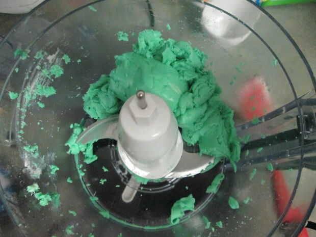 Este es el punto donde añadir unas gotas de colorante. Pulso hasta que el colorante se extiende uniformemente aunque el caramelo de menta.