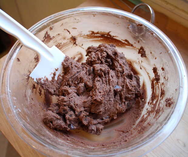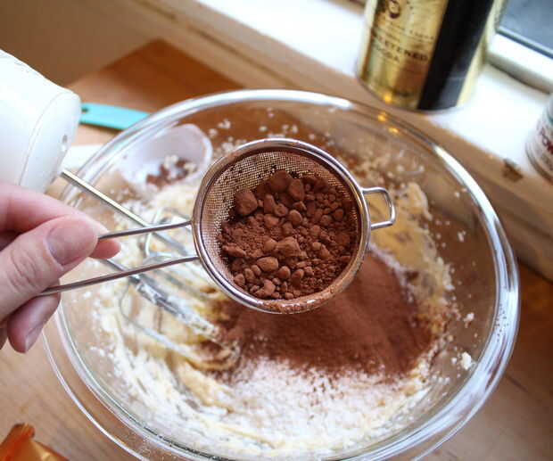 Una vez que todo está bien combinado, mezclar la harina, el cacao y el polvo de hornear. Tengo vagos y simplemente vierte un tamiz en lugar de combinar en un recipiente separado antes. :)