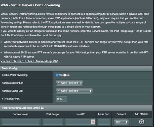 Aquí obtengo alguna información acerca de Virtual Server/Port Forwarding. Hay una parte media llamada "Config básica" se salte esta sección. La sección inferior es donde configuraremos nuestro entorno para port forwarding su llamado "expedición lista de puertos".