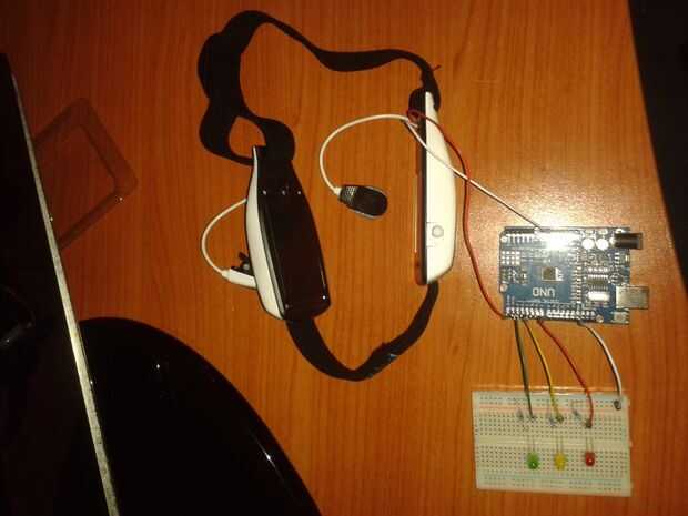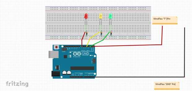 Después de esto, tienes que conectar el cable de tierra del MindFlex a la tierra del Arduino, y la "T" cable a arduino 0 pin (RX).