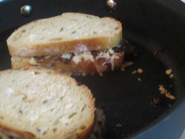 Coloque una rebanada de pan, mantequilla lado abajo, en la sartén y espolvorear un poco de queso en la parte superior. Con un tenedor, distribuir la cebolla a la parte superior del queso. Ahora espolvorear más queso encima de las cebollas para el sándwich entero se funden juntos. Finalmente Coloque la segunda pieza de pan en la parte superior, lado de la mantequilla hacia arriba.