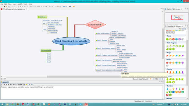 Insertar notas seleccionando un nodo y presionando F4 o va el menú modificar. Una caja se abrirá y puede introducir texto e imágenes y dar formato al texto. Le permitirá saber que pulsar F4 para abrir la ventana de notas y esto aparece una ventana que se extiende por la parte inferior de la pantalla.