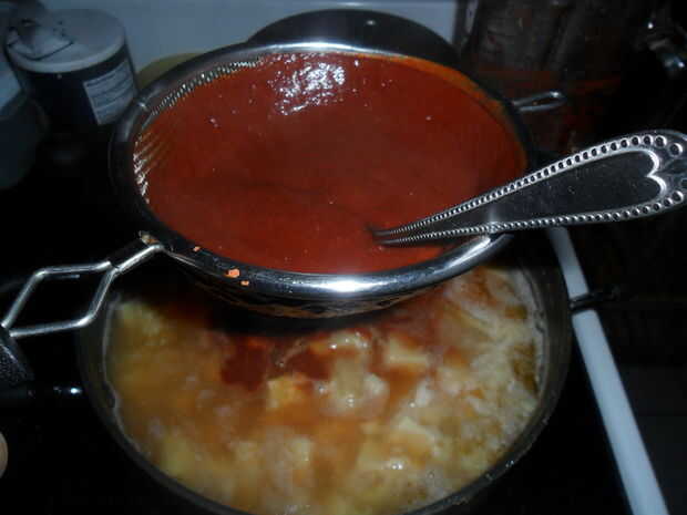 Así que después de haber ventilado hacia fuera de su casa y quemó todo el incienso... Compruebe la ternura de la pansa. Debe ser masticable. Abre las dos latas de maíz y de drenaje, añadir a la sopa.  Dejar el maíz simmer en la sopa durante media hora.  Añadir la salsa de enchilada y revolver hasta que la sopa es un hermoso anaranjado profundo. Que este fuego lento otra hora o así... mejora el olor. Después de una hora, sabor.