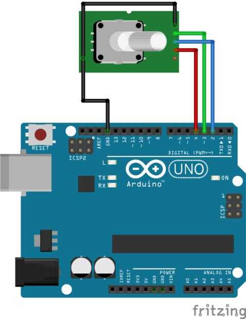 Las conexiones de hardware adicional que necesita para hacer uso del botón de centro se muestran en las fotos. Yo Fritzing para dibujar el diagrama pero no tienen un componente de codificador rotatorio que representa el esquema de los terminales más probable, así que utilice ese diagrama en conjunto con las notas y mira la foto del codificador rotatorio para ver lo que es más probable que estés buscando en términos de esquema codificador rotatorio de los terminales.