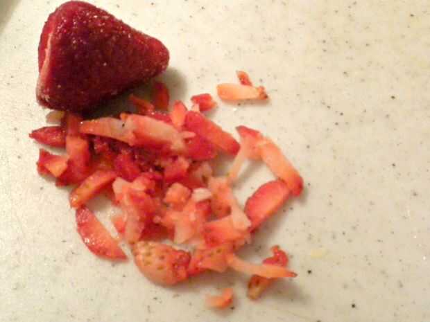 En 1 recipiente añadir la yema de huevo, 2 cucharadas de azúcar, el almidón de maíz y la leche evaporada. Jugo del limón en el otro recipiente. Dados sus pequeñas fresas y agregar a su jugo de limón. Añadir 2 cucharadas de azúcar en la y alguna salsa picante a tu gusto. Mezclar ambas mezclas.