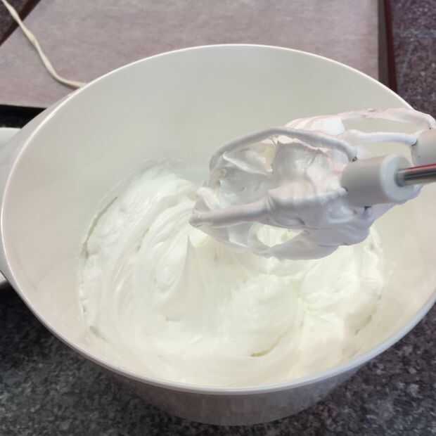 Utilizar una batidora eléctrica de mano para batir las claras de huevo, aumentando la velocidad poco a poco, hasta que formen picos. Añadir el azúcar una cucharada a la vez, batiendo bien. La mezcla debe ser muy dura y brillante.