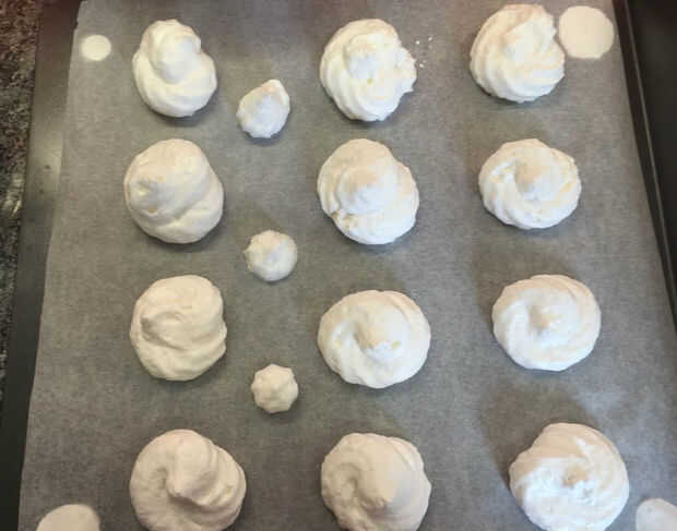 Transferir la mezcla a una manga pastelera. Los merengues en hojas para hornear forrada con la tubería.