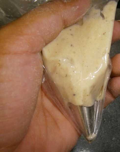 Tomar una bandeja de horno forrada y empezar a tubería de la mezcla. Hacer un pequeño montículo antes de la película. Hornear a 120 grados Celsius por 15 minutos.