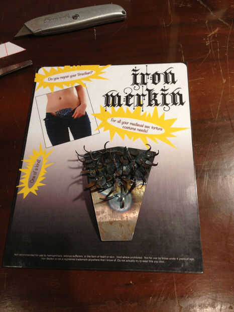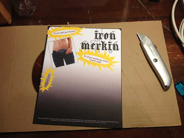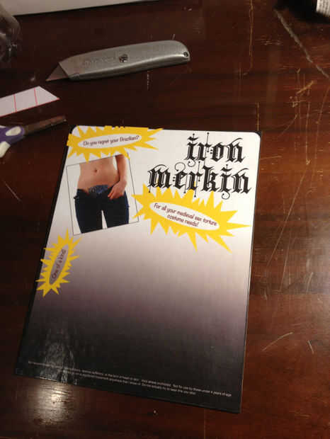 Quería que la cosa para echar un vistazo de un producto, y parecía bastante sencillo darle una cartulina base Marketing en él. He utilizado Photoshop para improvisar algo vagamente como un producto, pedir prestado una imagen de Erika Tanith para el modelo de merkin (¡ gracias Erika!). Imprimí este (papel fotográfico hubiera funcionado bien pero no tengo ninguna) y pegado a un pedazo de cartón usando pegamento de aerosol, recortar a la medida con un cuchillo. Luego pongo una hoja que lamina encima para conseguir el brillo (doblando los bordes alrededor de detrás, que no empaquetado normalmente funciona pero Hey).