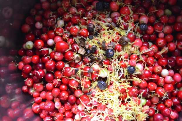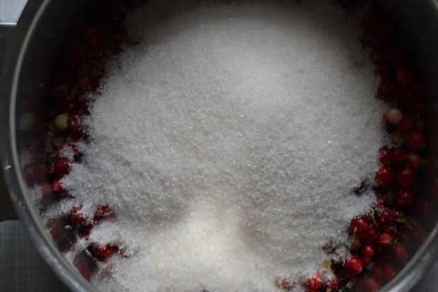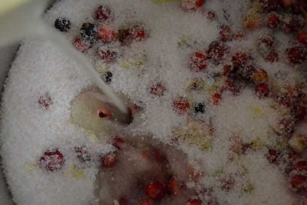 poner las frutas lavadas en una olla, rallar la cáscara de limón en la olla, añadir (ligeramente triturada) enebro y pimienta de Jamaica. Añadir el mismo peso en azúcar como las frutas del bosque y finalmente el jugo del limón.