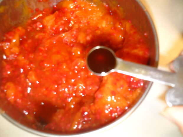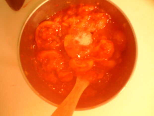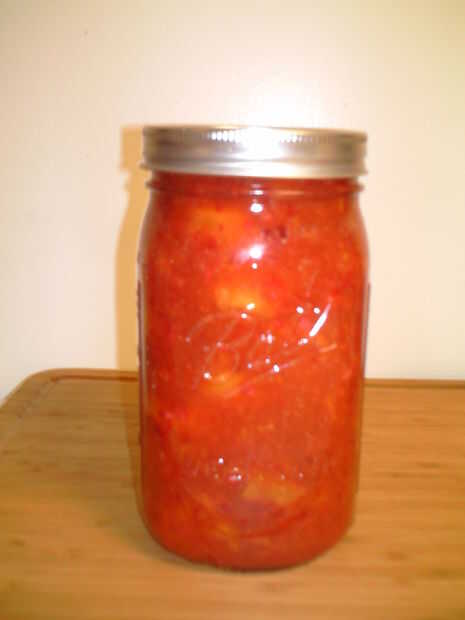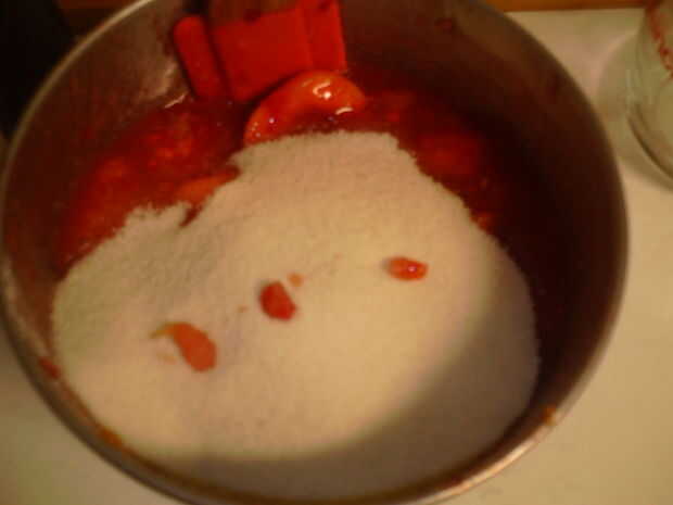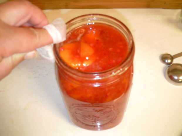 Vierta la mezcla en el tarro de pinta grande (lavada en agua jabonosa caliente, enjuagada en caliente y se coloca sobre una toalla de papel limpia)