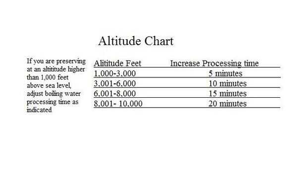 ** Dependiendo de su elevación, se podría necesitar más tiempo. Consulte el gráfico a continuación para ver si necesita agregar tiempo. Por ejemplo yo vivo unos 3.500 por encima para añadir unos 7-10 minutos a mi tiempo de procesamiento. Así que para esta receta, tiempo de procesamiento fue de 17-20 minutos y luego... 5 minutos de la sesión.