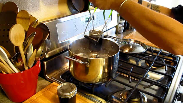 Coloque suavemente los frascos en la olla de agua hirviendo, agregar más agua si es necesario para asegurarse de que estén completamente cubiertos. Después de que el agua vuelve a hervir todo, empezar a tiempo y hervir durante 10 minutos (ajuste como sea necesario basado en la altitud).