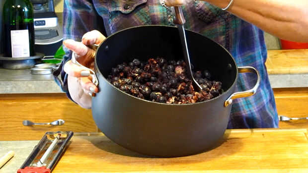En una olla grande y pesada agregar 1/2 de las bayas y empezar a triturar con un machacador. Añadir 1/2 del azúcar y el puré hasta que se rompen la mayoría de las frutas y jugos han comenzado a fluir.