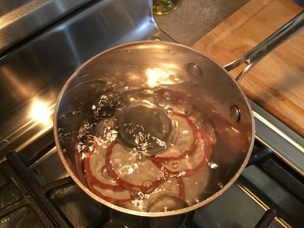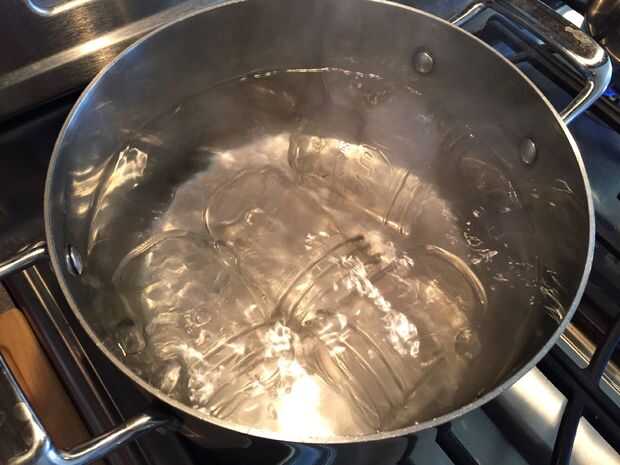 Frascos limpios en agua y llevar a hervir para esterilizar, hierva unos 5 minutos. Coloque las tapas del tarro en una olla más pequeña de agua y hervir. Es importante que las tapas lo suficientemente calientes como para formar un buen sello durante el proceso de enlatado.
