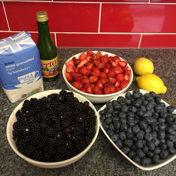 Unos 2 kg Bayas - usé cantidades iguales de arándanos, moras silvestres y fresas pequeñas (casco y reducido a la mitad).