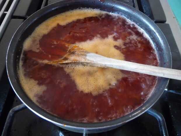 - Cocinar a fuego lento destapado, revolviendo de vez en cuando hasta que el agua de la mermelada se reduce a una consistencia de jarabe espeso.