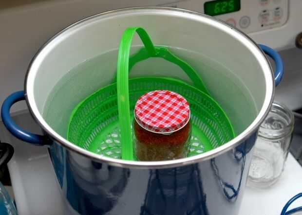 Añadir tarros para conservas cesta. Debe haber 1-2 pulgadas de agua por encima de la jar(s). Llevar a hervir y tapa, hirviendo durante diez minutos.