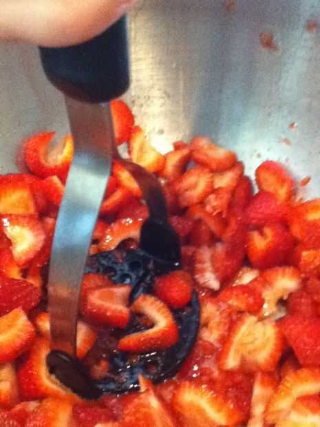 Cuando han llenado para arriba la mezcla 1/8 de la forma del tazón de fuente, utilice el Machacador de papas para aplastar las fresas.