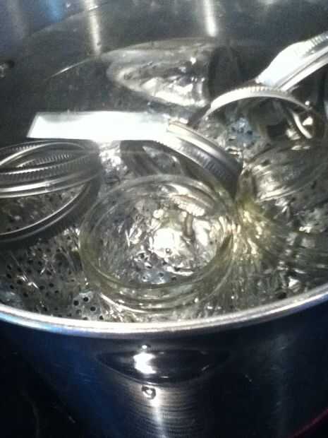 Mientras tanto, tener otra olla muy grande en otro quemador. Llenarlo con agua y poner agua a hervir. Luego coloque unos frascos en el agua para esterilizarlas.