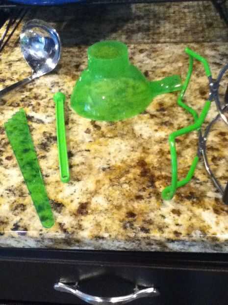 Estas son las herramientas que se usa para eliminar las partes de la jarra de agua hirviendo. La cosa verde larga y flaca se llama un levantador. Tiene un imán en el extremo. El embudo se utilizará para cuidadosamente Vierta la mermelada en los tarros. Se utilizará la regla para medir. Y la garra tome la parte de cristal de la jarra.