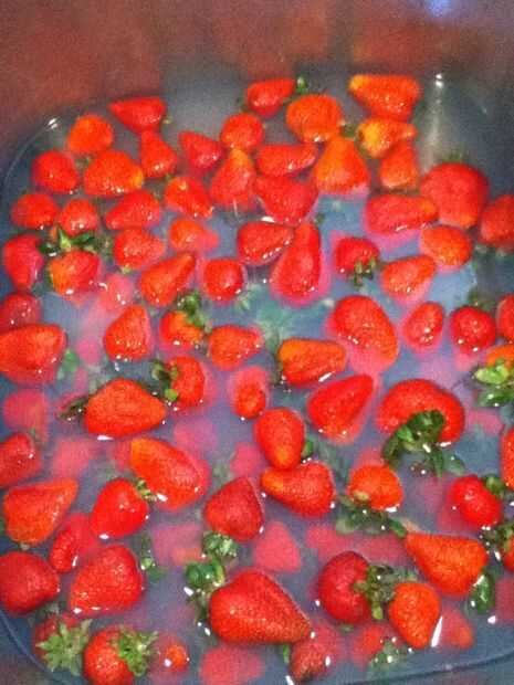 Ya que hay toneladas de fresas para lavar, puede utilizar usted fregadero. Llénalo hasta la mitad y poner algunas fresas en.