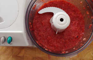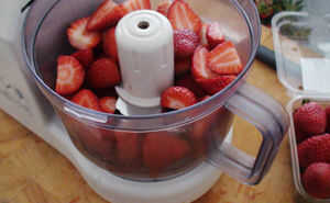 A continuación, mezclar las bayas hasta que es tan suave o tan grueso como te como tu mermelada. Encuentra el procesador de alimentos funciona bien, pero utilizar lo que tienes. La idea es romper las bayas. Fresas que romper un poco más que otras bayas.