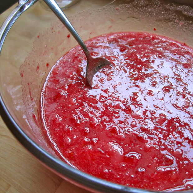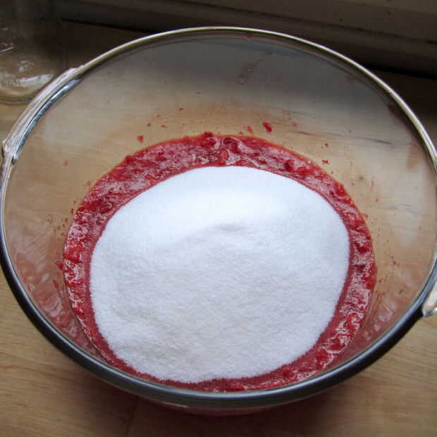 Una vez que los granos son molidos, añadir el azúcar. Si has usado dos pintas de fresas, de él cuatro copas - una pinta de fresas es dos tazas de azúcar.