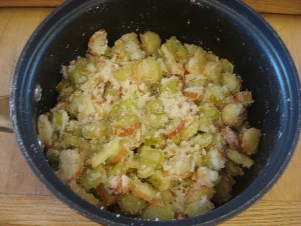 Mezcla de ruibarbo y azúcar en una cacerola. Luego dejarlo cubierto en el refrigerador durante unas ocho horas. Si consigues impaciente ponen por la noche luego termine el atasco de la mañana.