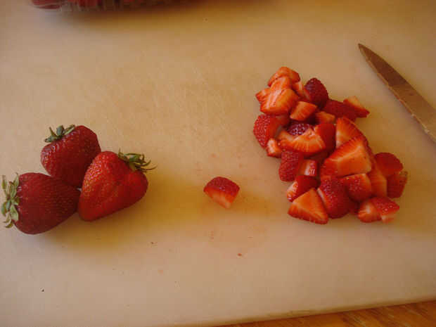 Despedazar mientras esperas el ruibarbo, 1 taza de fresas. Sin embargo grande ahora es cuánto van a estar en el final jam lo corte a su apreciación.